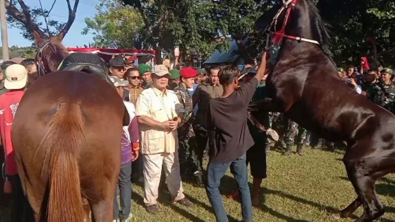 Usai melihat air bersih dari sumur bor bantuannya terabut, Menhan RI kemudian melihat langsung 4 ekor kuda jantan yang merupakan kuda pacuan tersebut. Bahkan Prabowo Subianto sempat memegang langsung kuda kuda juara tersebut.