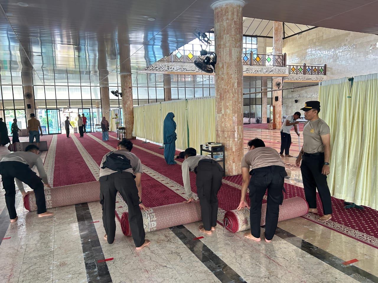 Mereka terlihat melakukan berbagai aktivitas, seperti menyapu halaman, mencabut rumput, membersihkan lantai masjid, membuang sampah, serta merapikan tanaman di sekitar masjid.