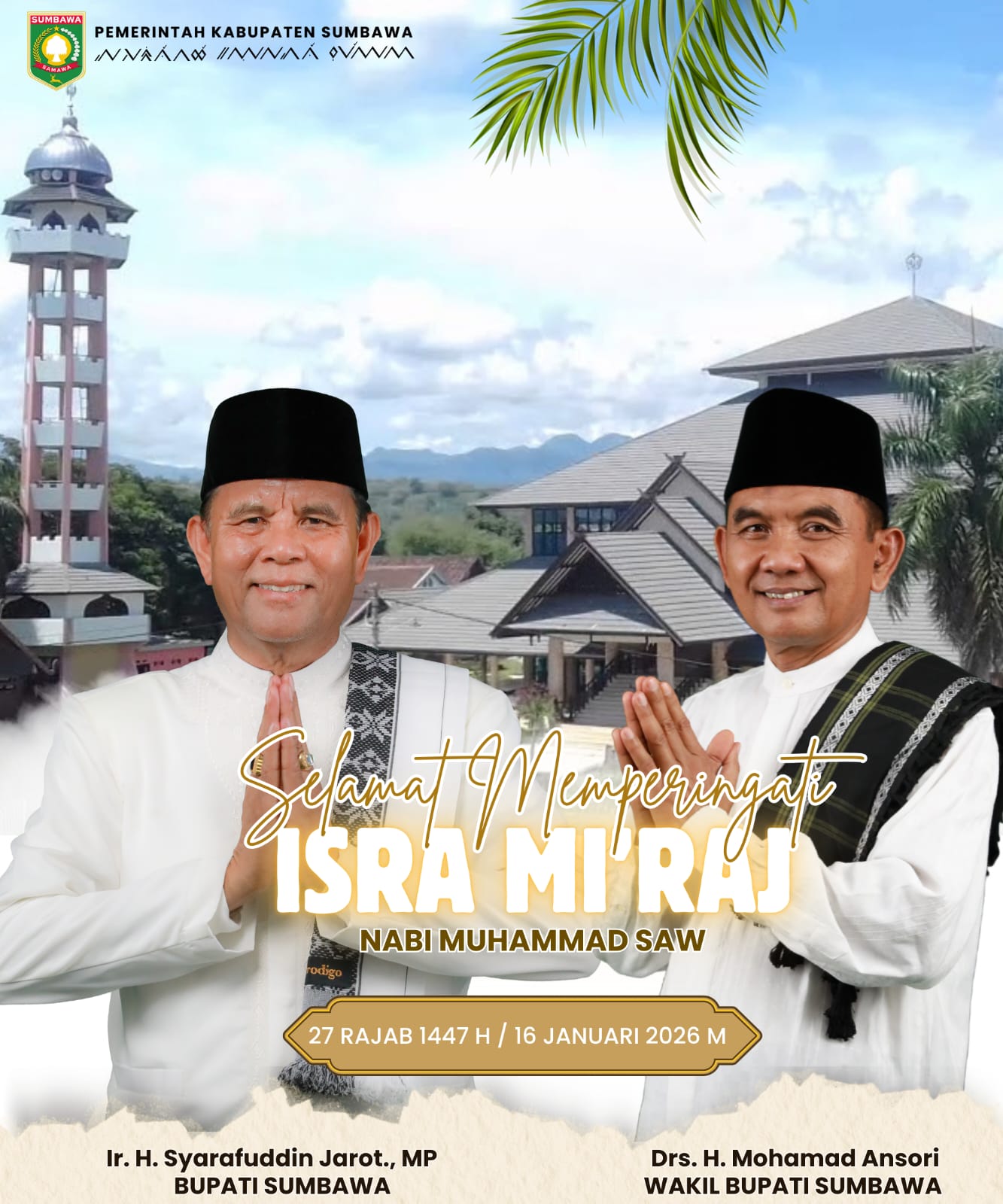 Bupati dan Wakil Bupati Sumbawa, atas nama Pemerintah Kabupaten Sumbawa; menyampaikan ucapan Selamat Memperingati Isra Mi’raj 1447 H.