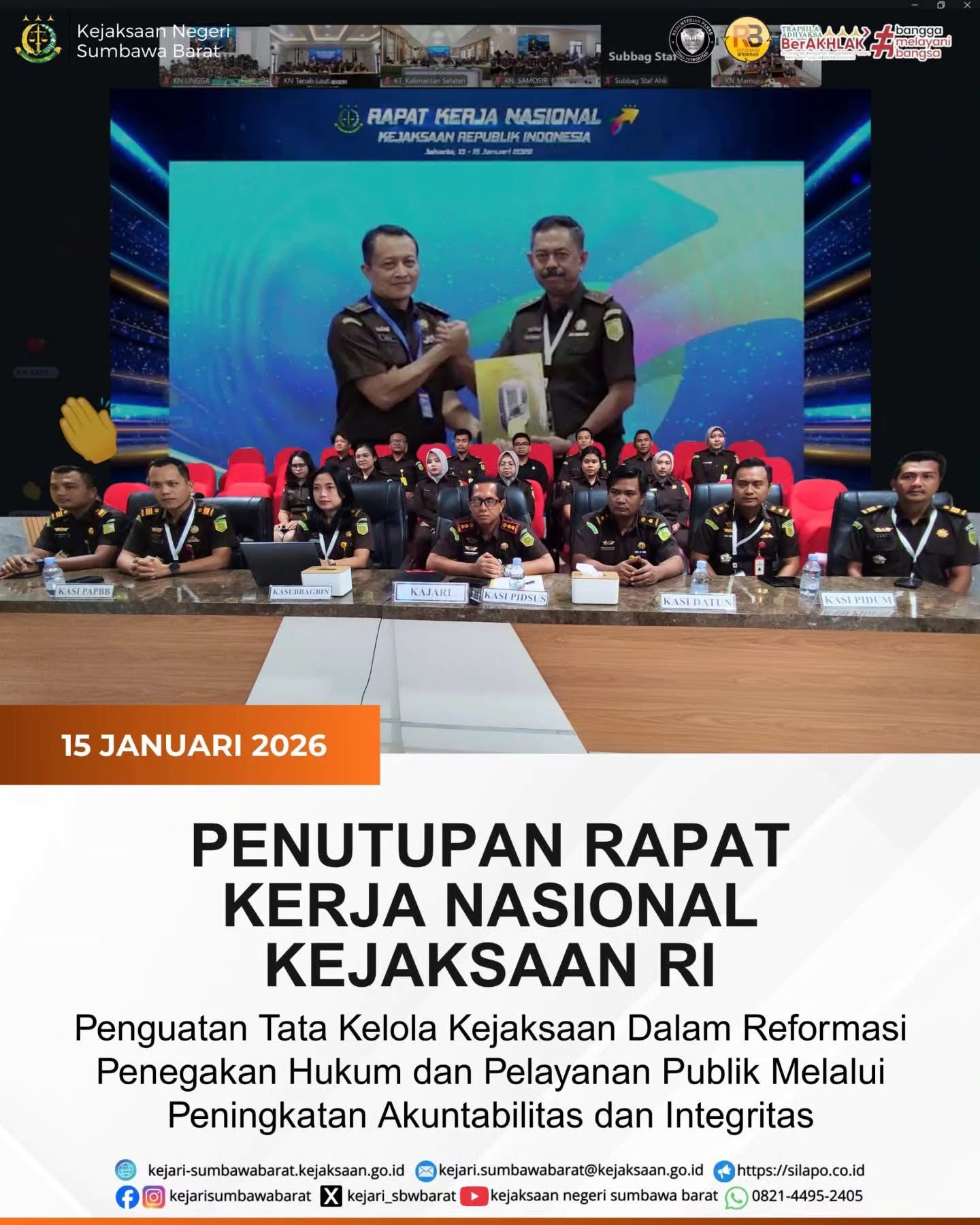 Kepala Kejaksaan Negeri Sumbawa Barat Agung Pamungkas, S. H,. M. H, didampingi oleh Para Kepala Seksi dan Kasubbag Pembinaan beserta seluruh jajaran mengikuti kegiatan Penutupan Rakernas (Rapat Kerja Nasional) Kejaksaan Republik Indonesia yang dilakukan secara daring di Ruang Video Conference Lt. 1 Kantor Kejari Sumbawa Barat.