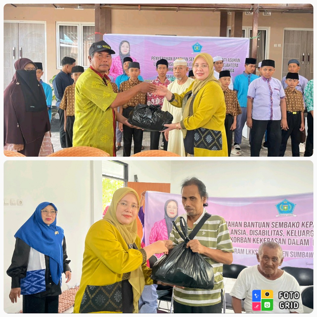Sumbawa, Bintangtv.id– Ketua Umum Lembaga Koordinasi Kesejahteraan Sosial (LKKS) Kabupaten Sumbawa, Hj. Ida Fitria Jarot, SE, menyalurkan bantuan sembako kepada penyandang disabilitas, lansia, serta empat Lembaga Kesejahteraan Sosial Anak (LKSA), sebagai bentuk kepedulian terhadap Penyandang Masalah Kesejahteraan Sosial (PMKS).